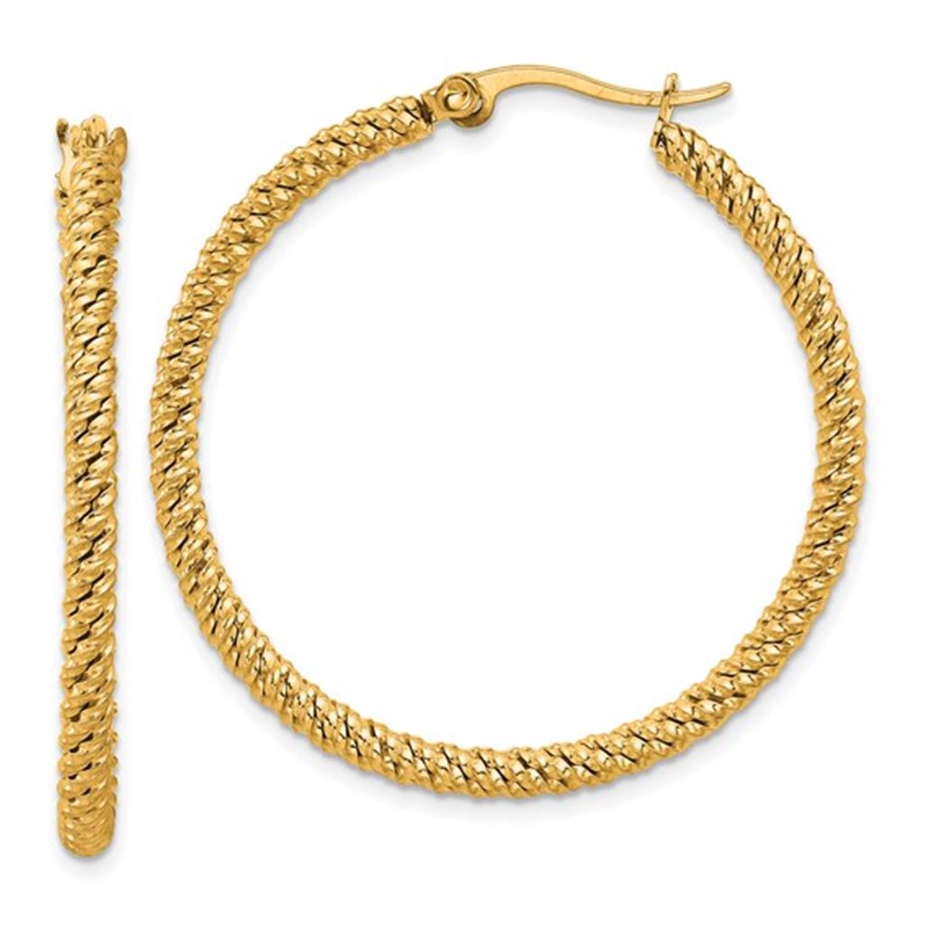 Stainless Steel Yellow Plate Polished Textured Hoop Earrings